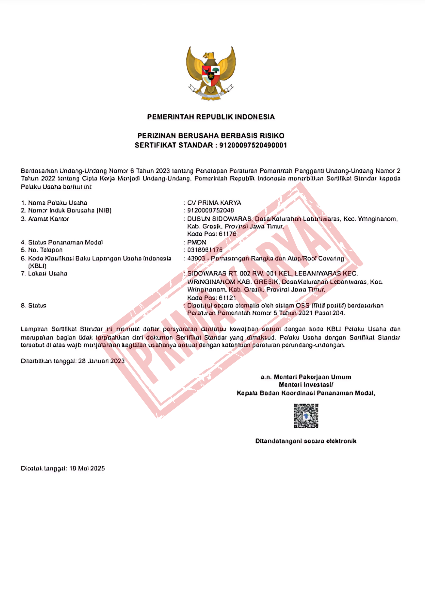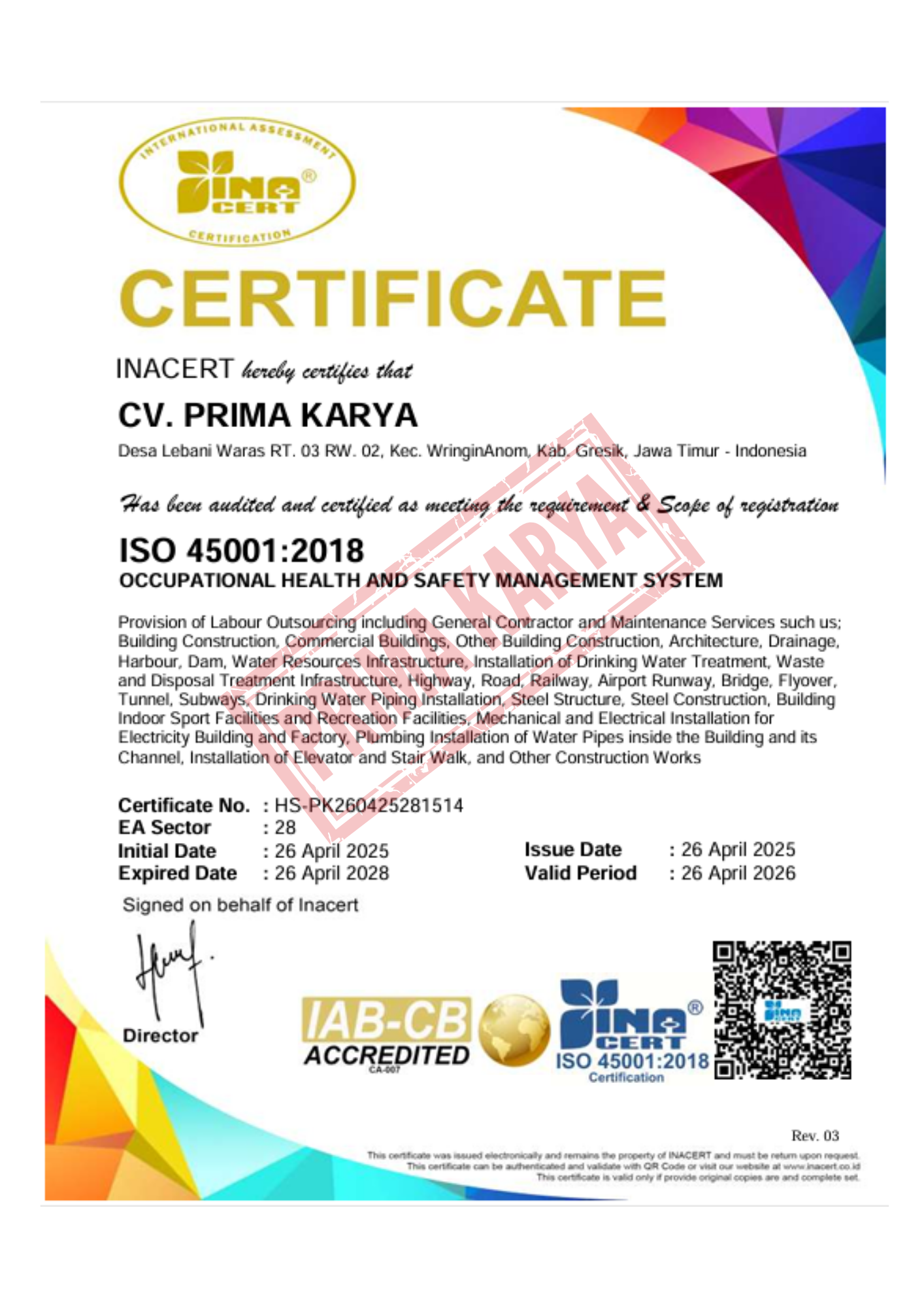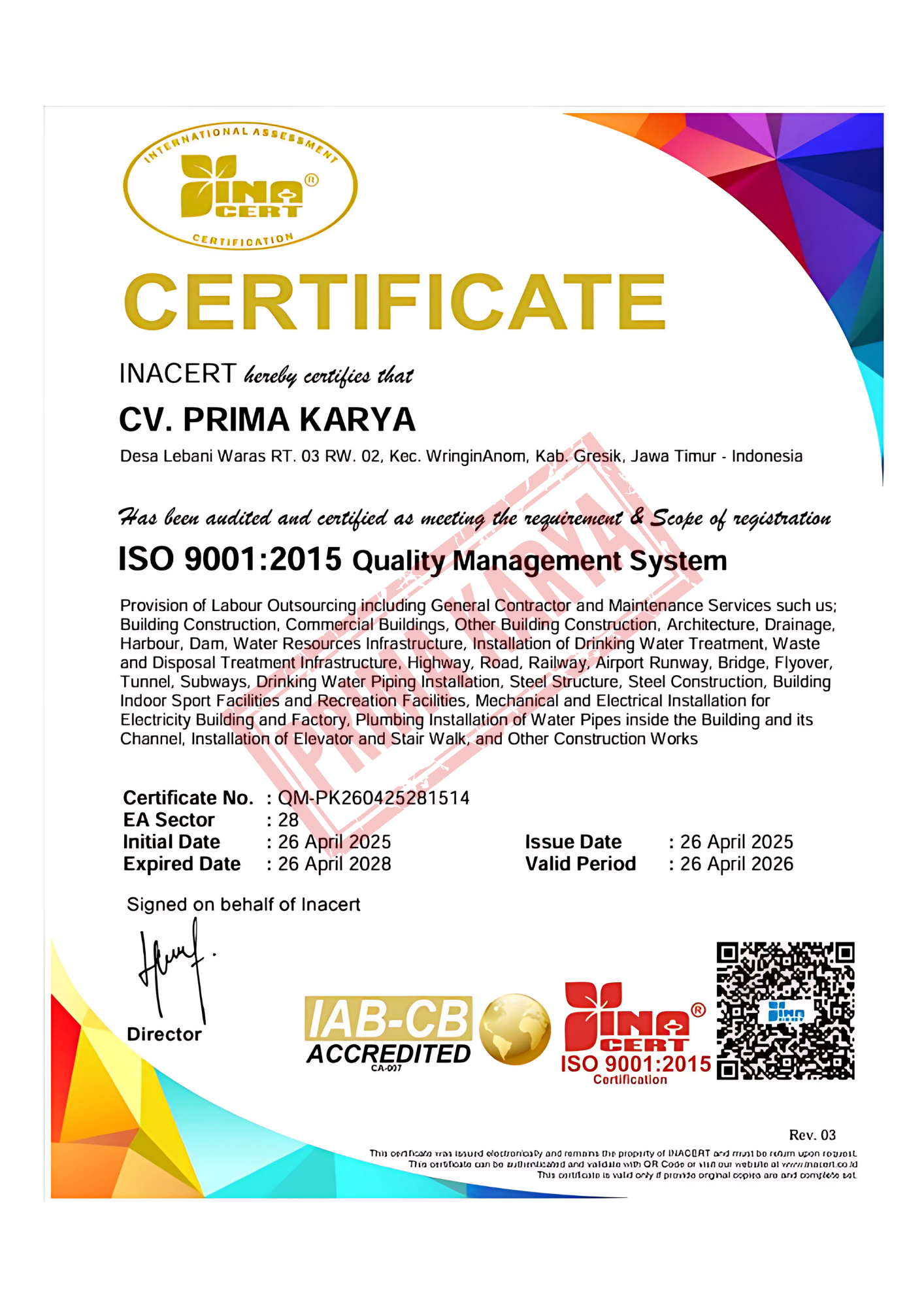 Berikut adalah beberapa sertifikat yang dimiliki oleh CV. Prima Karya sebagai bukti komitmen kami terhadap kualitas dan profesionalisme.