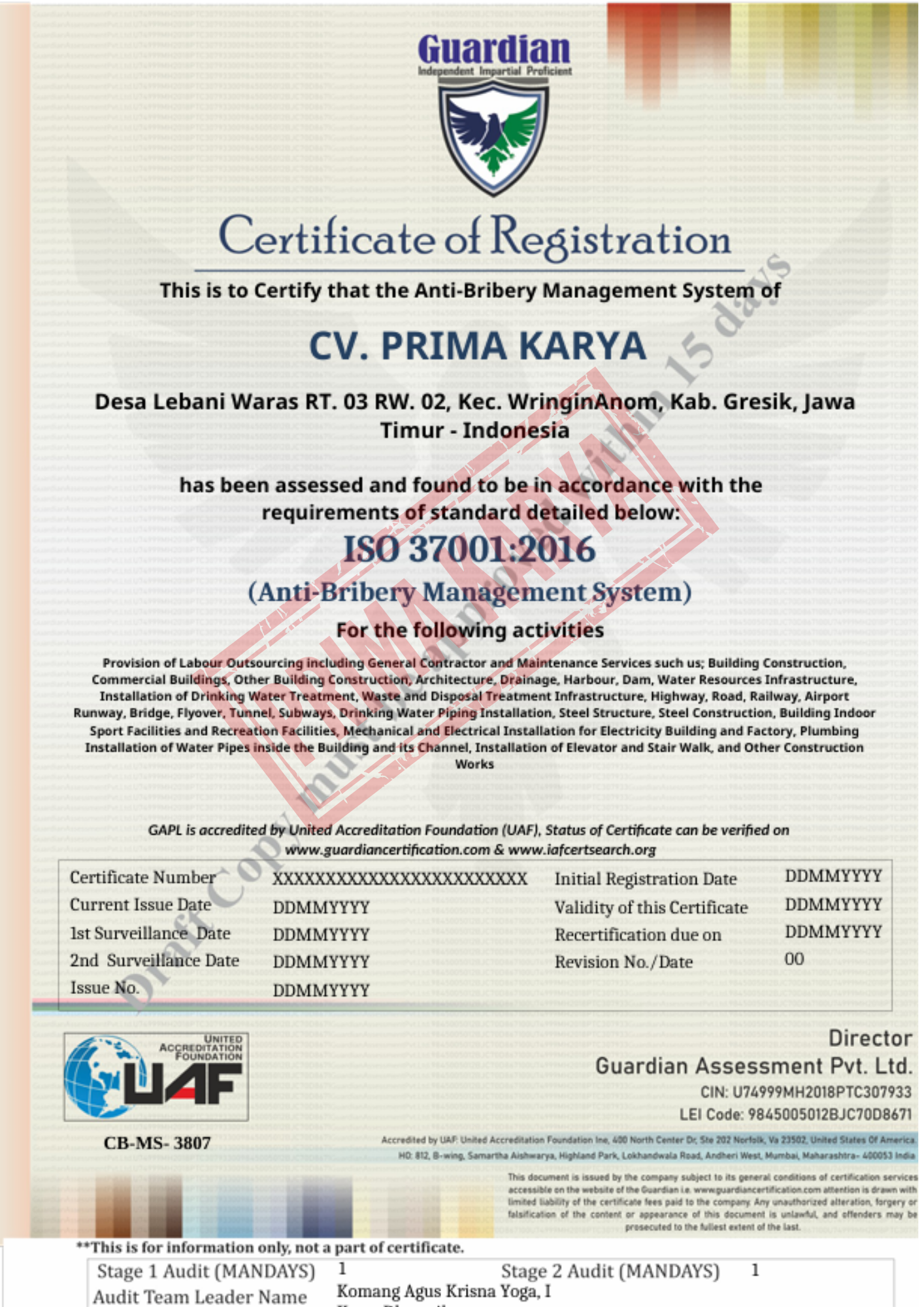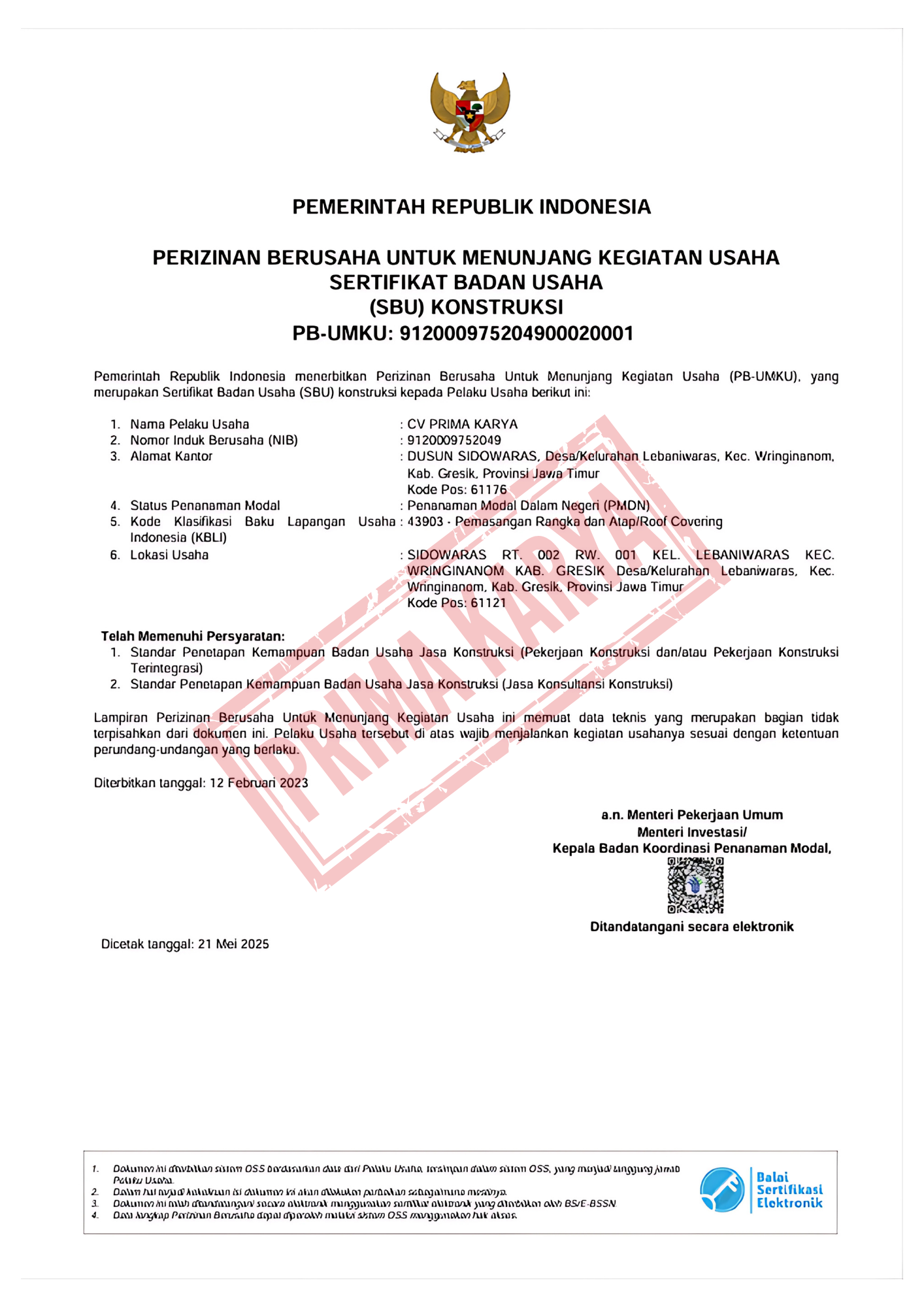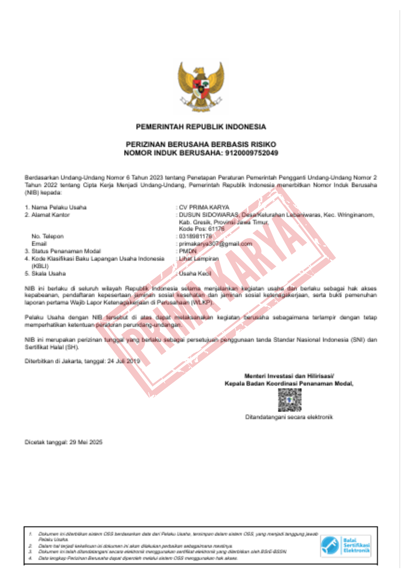 Berikut adalah beberapa sertifikat yang dimiliki oleh CV. Prima Karya sebagai bukti komitmen kami terhadap kualitas dan profesionalisme.
